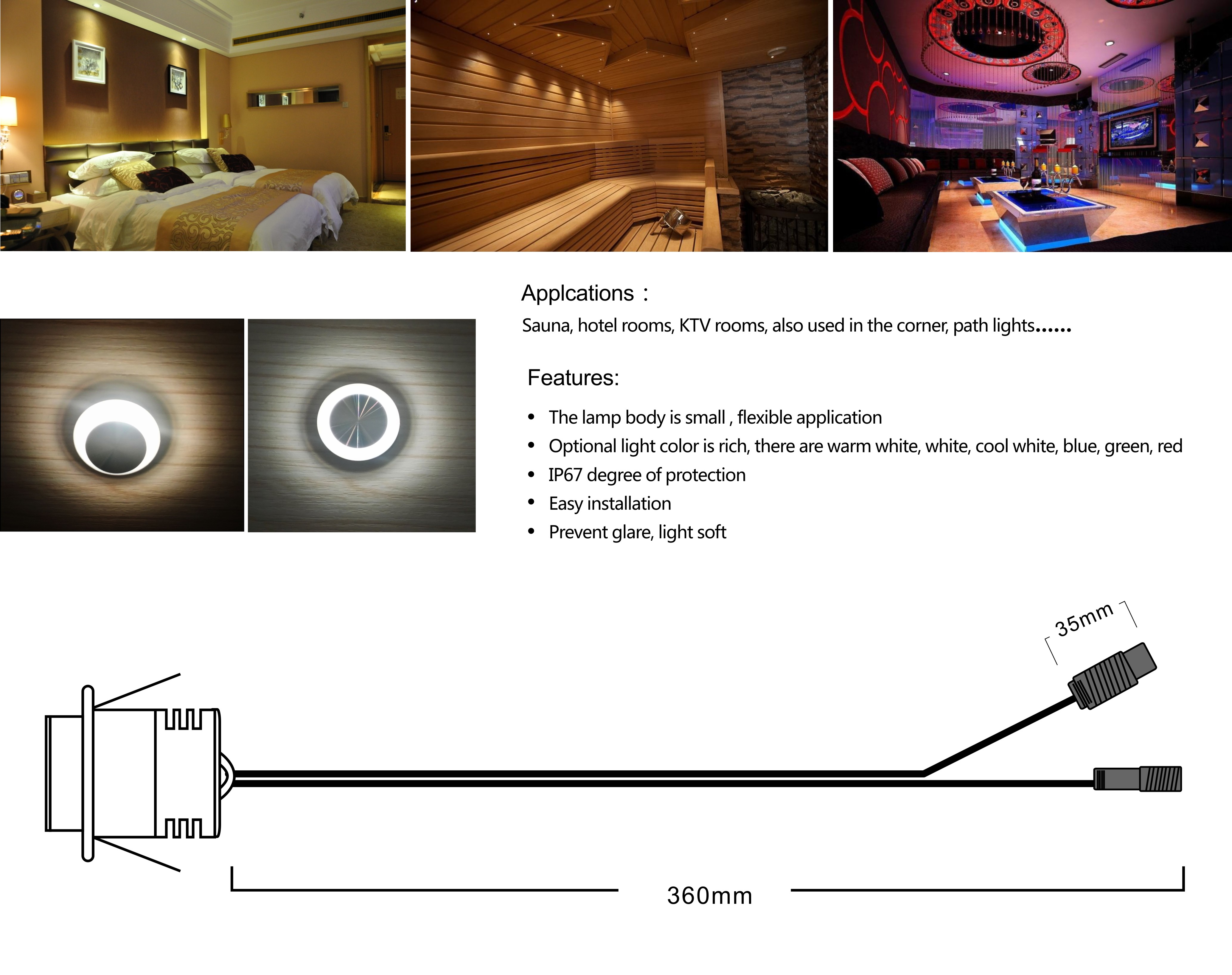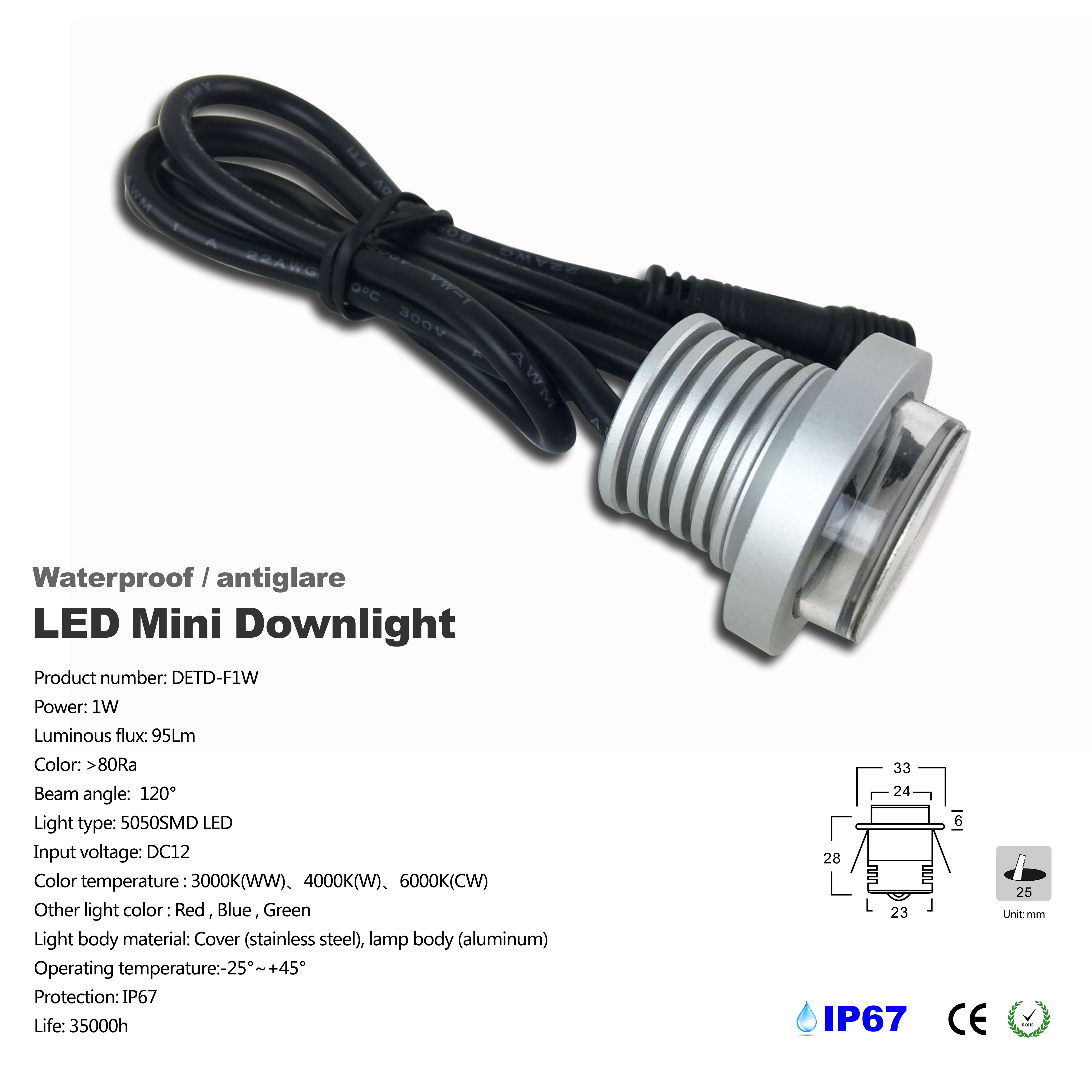 MiniLEDdownlight1W,95LM,AC90-260V,DC12V,IP65,80Ra,color temperature :3000K,4000K,6000k,other light color:red,blue,green Images |